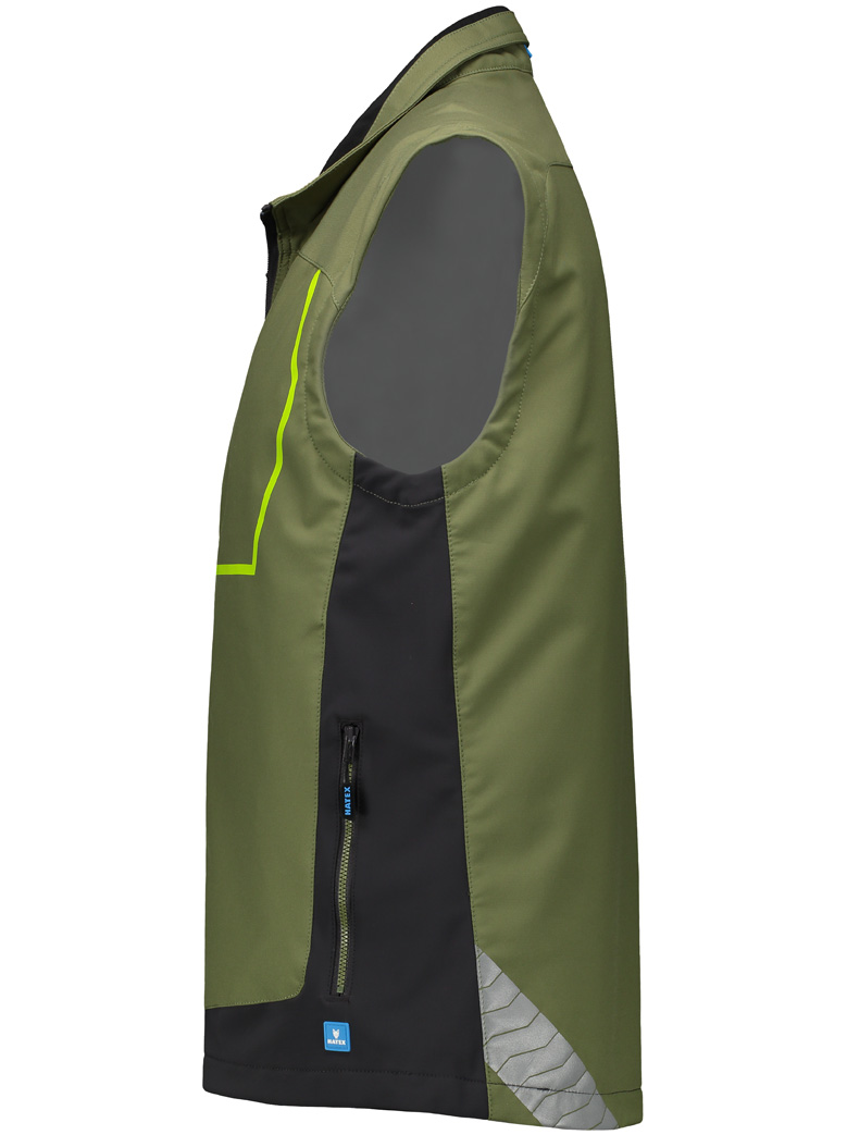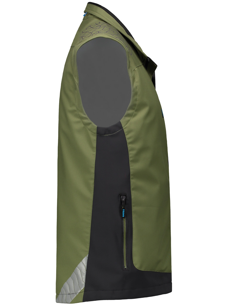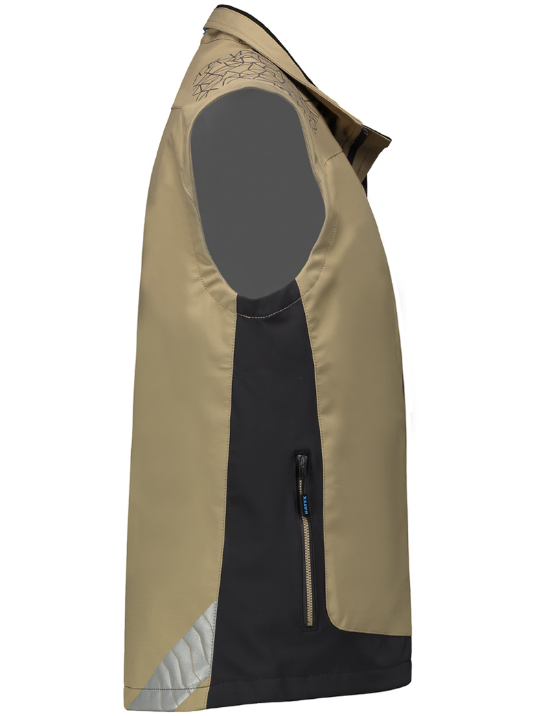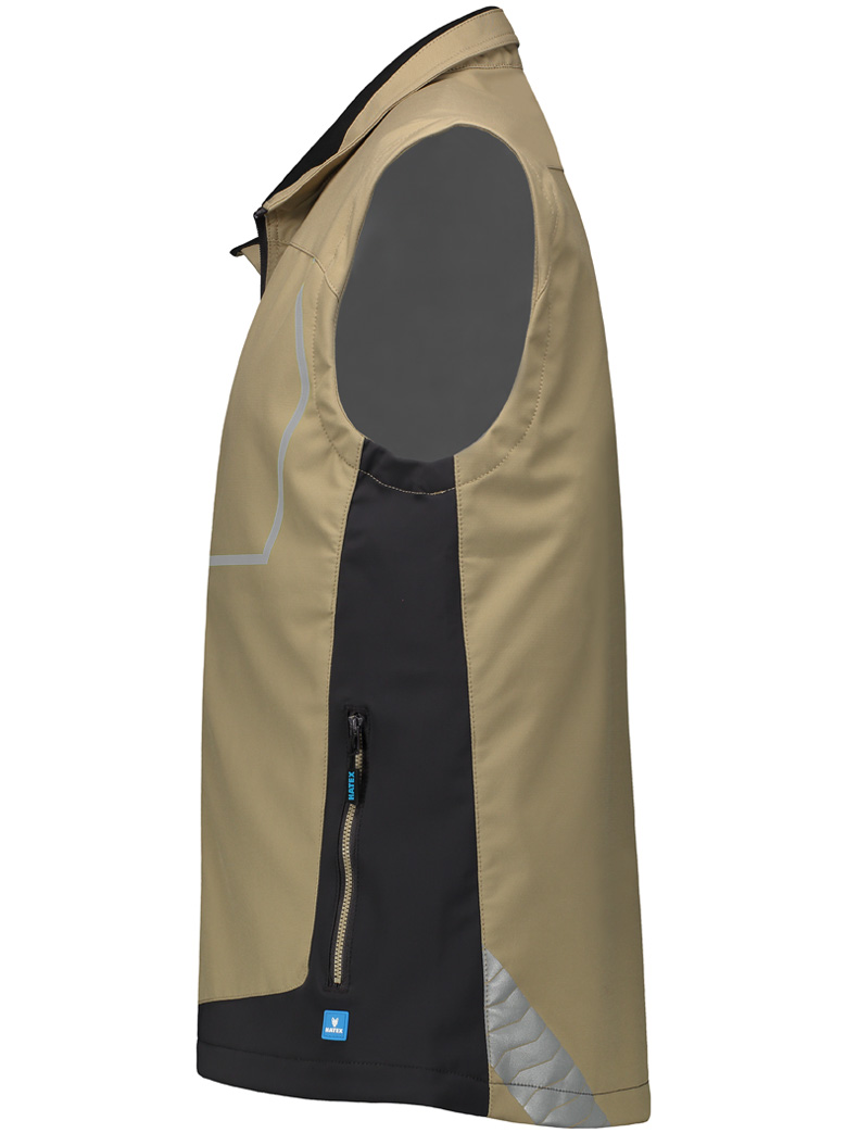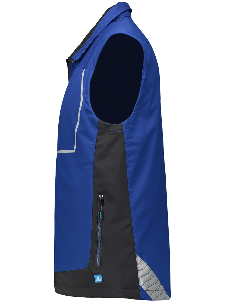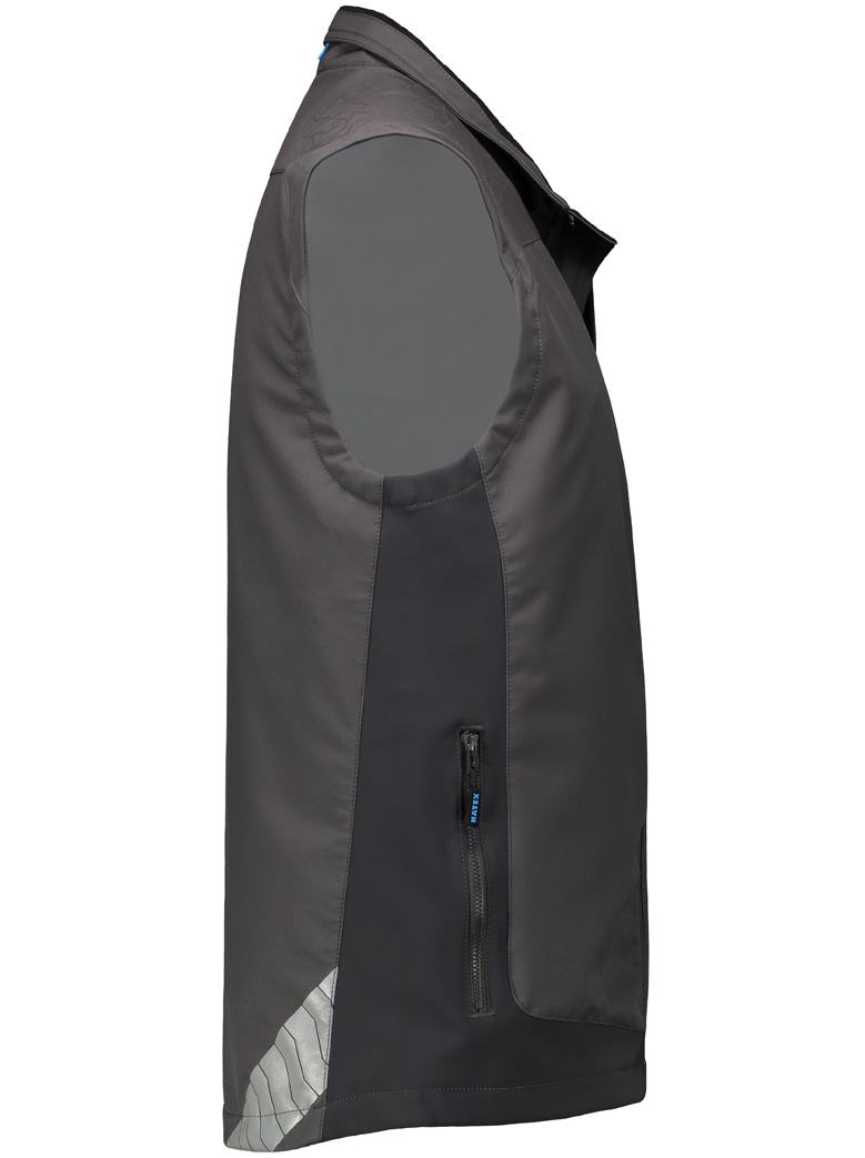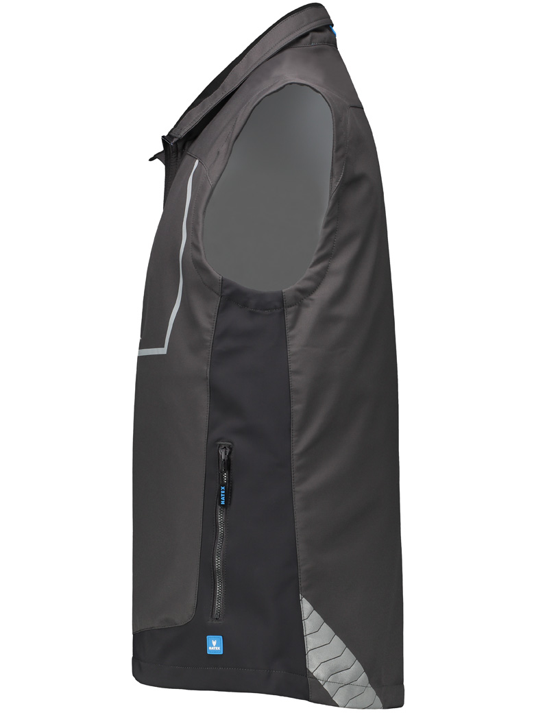 Für dieses Softshellgilet verwenden wir einen Materialmix aus zwei unterschiedlich dehnbaren Softshells. Im Torsobereich, wo Langlebigkeit wichtig ist, wird ein scheuerbeständiger Softshell mit gewobenem Oberstoff eingesetzt. Seitlich verfügt das Gilet über einen hochelastischen 4-Wege Stretch Softshell. Dieser sorgt für einen perfekten Sitz. Auch bei bewegungsintensiven Arbeiten. Beide Softshellstoffe sind mit einer Membrane ausgerüstet und sind dadurch wasserdicht und 100% winddicht. Die Nähte des Softshellgilets sind nicht verschweisst und dadurch nur bedingt wasserfest.